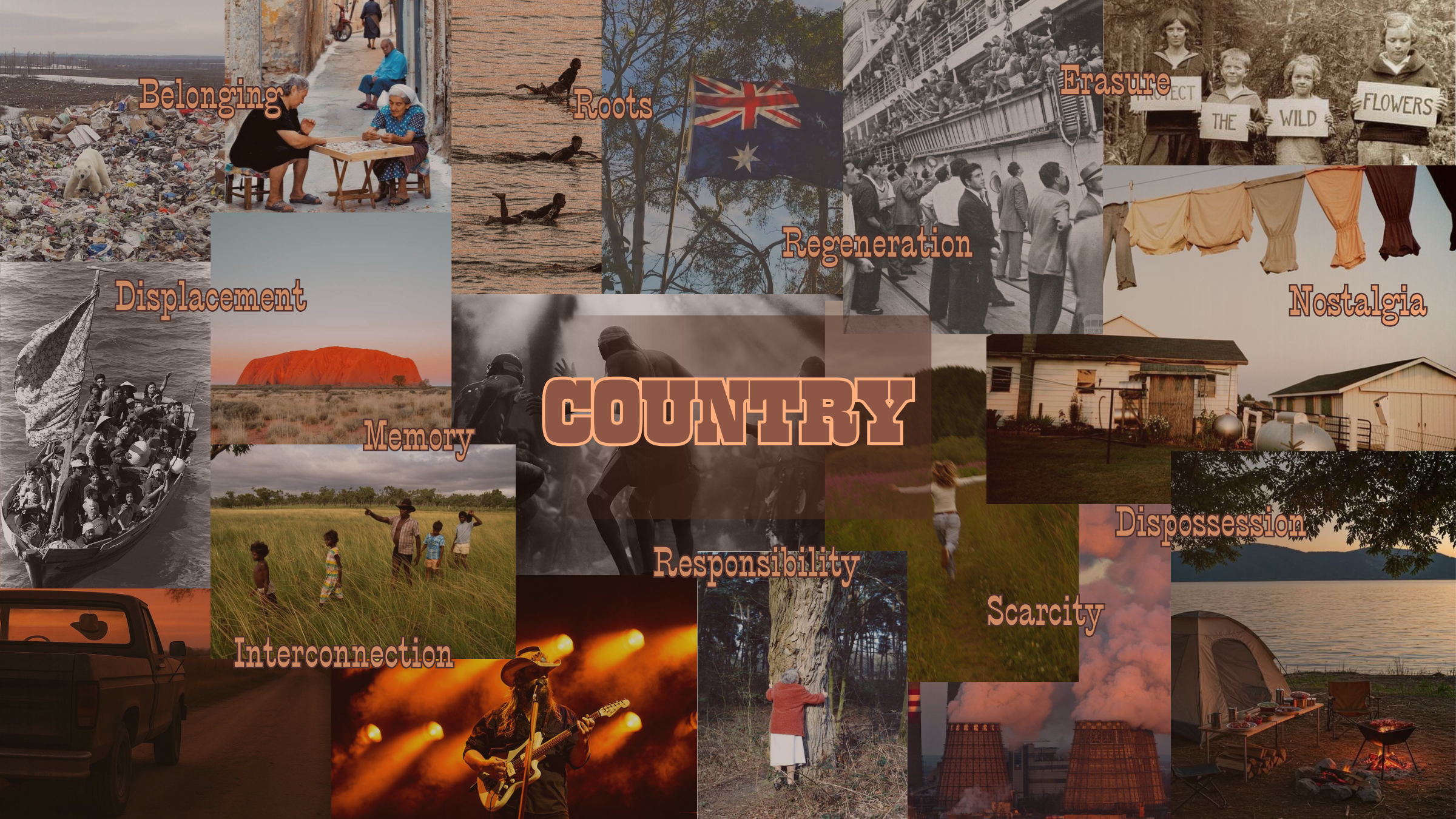 Explorations of physical land and country, local and international, loss of country and dispossession, remembering country and nostalgia, migration, the power of connections with land, climate change and the changing landscape, and imagined countries.